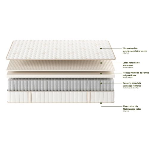 Deze matras van biologische latex en schuim is ontworpen voor mensen die op zoek zijn naar een zeer comfortabele, uitgebalanceerde matras met middelmatige ondersteuning.
